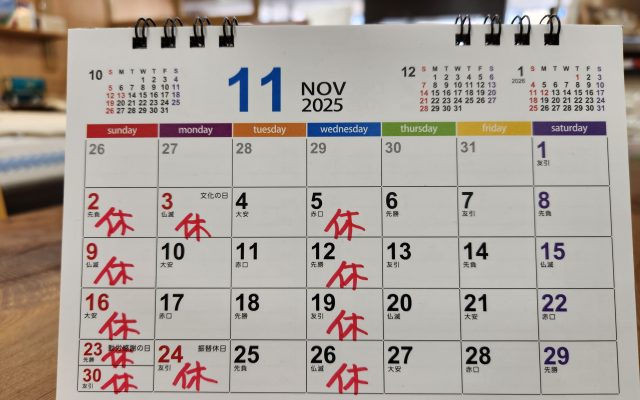 11月休業日のお知らせです。 11月も水曜・日曜・祝日が休業日です。 休業日でも店内にスタッフ在店してますので事前にご来店ご予約頂けますと応対出来ます。また、ご訪問(クリーニング・打ち直しリフォーム・貸し布団等)いつでも ...続きを読む(2025年11月01日)